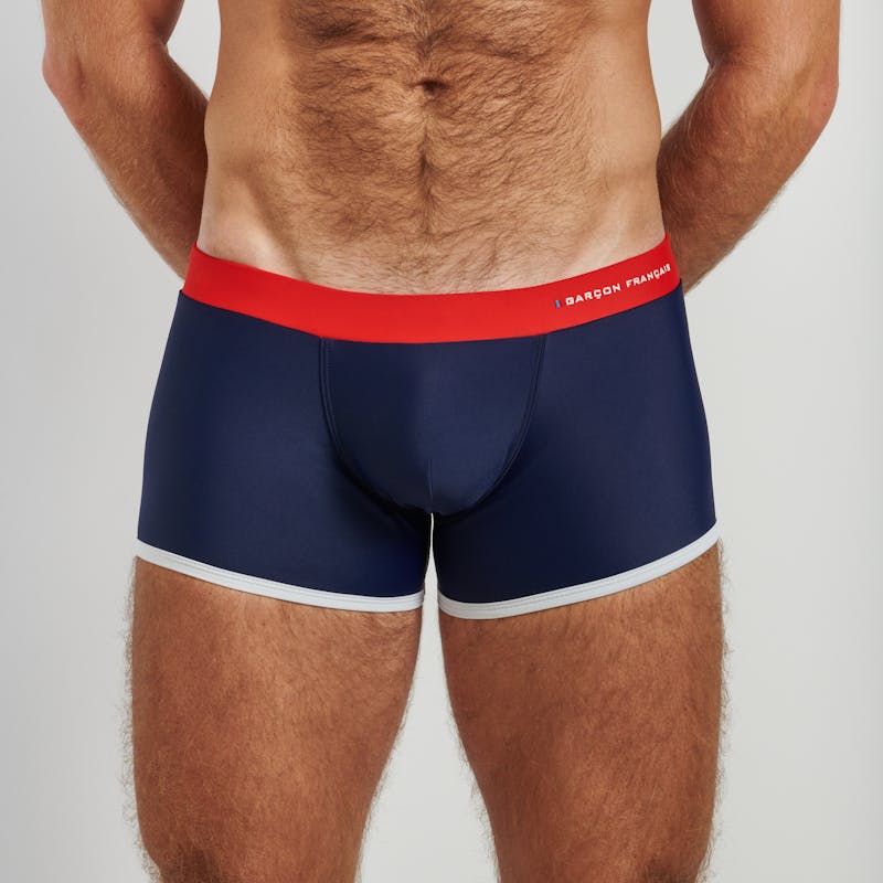 Flag swim trunks, low-rise with a flattering fit.